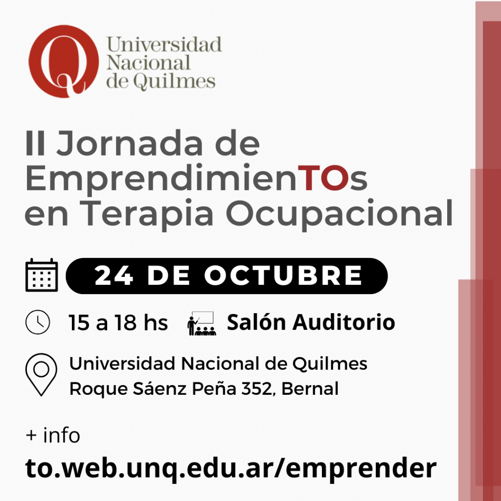 La Licenciatura en Terapia Ocupacional de la Universidad Nacional de Quilmes invita a participar de las II Jornadas de Emprendimientos en Terapia Ocupacional, que se realizarán el viernes 24 de octubre de 15 a 18 hs en el Salón Auditorio de la UNQ.